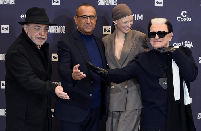 (L-R) Italian model Bianca Balti, Sanremo Festival host and artistic director Carlo Conti, Italian singer Damiano David, Italian Tv personality Cristiano Malgioglio, Italian actor Nino Frassica during a press conference during the 75th edition of the Sanremo Italian Song Festival, in Sanremo, Italy, 12 February 2025. The music festival will run from 11 to 15 February 2025. ANSA/FABIO FRUSTACI