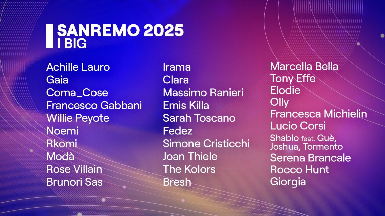 ROMA – Dopo tanti rumors, Carlo Conti ha finalmente svelato i nomi dei Big in gara al Festival di Sanremo 2025, in programma dall’11 al 15 febbraio. Il direttore artistico si è collegato in diretta durante l’edizione delle 13.30 del Tg1. “Da questa sera riprenderò a dormire tranquillo, in queste settimane è stato veramente difficile. I cantanti mi hanno messo in difficoltà. Così li abbiamo portati a 30“, ha dichiarato prima di pronunciare il cast definitivo. In gara tanti nomi attuali tra new entry e grandi ritorni. “È un cast particolarmente variegato– ha aggiunto Conti- ma saranno importanti le canzoni, c’è un po’ di tutto. Tanti sapori perché la musica italiana sta andando fortissimo. Avrebbero, però, meritato di essere in questa lista almeno altri 10 nomi. Ci sarà tempo, chissà. Magari nel 2026″.