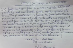 Il 22 febbraio scorso era il secondo anniversario della morte di sua moglie Lucia: “Il Papa all’epoca mi mandò un messaggio affettuosissimo e qualche mese fa mi aveva promesso che quel giorno avrebbe celebrato una Messa per lei”, racconta nell’intervista, “nei giorni in cui stava più male, e tutti eravamo preoccupati, ho detto a Lucia: ‘Pensaci tu, mettici una buona parola che il Papa deve restare ancora con noi'”.
