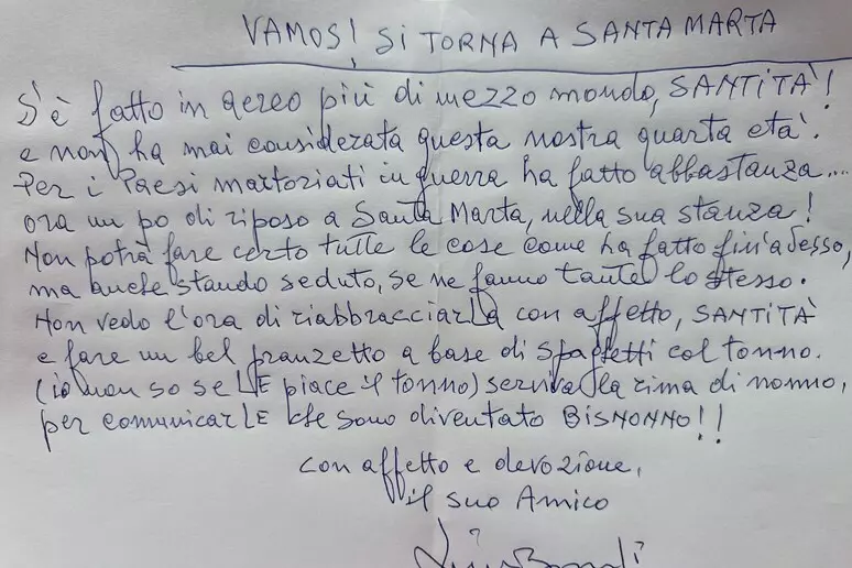 “Per i Paesi martoriati in guerra ha fatto abbastanza… ora un po’ di riposo a Santa Marta, nella sua stanza! / Non potrà fare certo tutte le cose come ha fatto fin’adesso, / ma anche stando seduto, se ne fanno tante lo stesso…”.