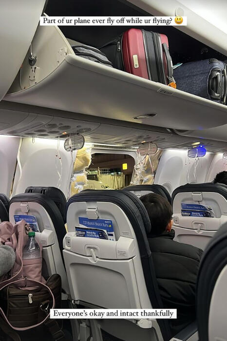 Frame di un video pubblicato su TikTok e su Instagram da “vy / elizabeth” in cui si vede il finestrino esploso del volo Alaska Airlines. +++ATTENZIONE: IL FRAME NON PUO’ ESSERE PUBBLICATO SENZA L’AUTORIZZAZIONE DELLA FONTE DI ORIGINE CUI SI RINVIA+++ NPK +++ (aereo)