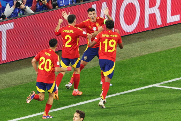 - SPAGNA (4-3-3): Unai Simón; Carvajal, Le Normand, Laporte, Cucurella; Pedri, Rodri, Fabián Ruiz; Yamal, Morata, Williams. Ct. de La Fuente