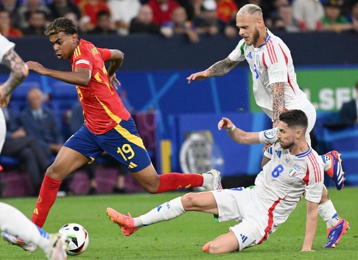 Spains forward Lamine Yamal struggles fot the ball with Italys midfielder Jorginho and Italys defender Federico Dimarco during their UEFA EURO 2024 group B match in Gelsenkirchen, Germany, 20 June 2024. ANSA/DANIEL DAL ZENNARO